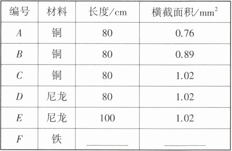 |编号|材料|长度/cm|横截面积$/mm^2$|