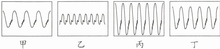 13. 曾侯乙编钟是我国迄今发现数量最多、音律最全的一套编钟.现有四个大小不同的编钟甲、乙、丙、丁,其中有一编钟上有一隐形的裂痕,会对其音色产生影响,为了查找出这口编钟,用锤子分别敲击它们,将所产生的声波输入同一个示波器中,以下四幅图为示波器中显示的波形图,则敲______编钟用力最大,______编钟有裂痕.