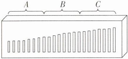 (2)音调与发声体振动的频率有关,频率越高,音调越高;A区的铜片较薄、较短,振动快,频率高,因此A区为高音区;C区的铜片较长、较厚,振动慢,频率低,因此C区为低音区。