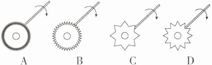9. 在自制乐器的实践活动中,牛顿小组将如图所示的齿数不同、大小和材料均相同的发音齿轮分别装在同一玩具电动机上.当电动机带动齿轮以相同的转速匀速转动时,将一张硬纸片分别接触不同的齿轮,硬纸片发出的音调分别为“do(1)”“re(2)”“mi(3)”“fa(4)”四个音阶,使纸片发出音调为“fa(4)”的齿轮为( )