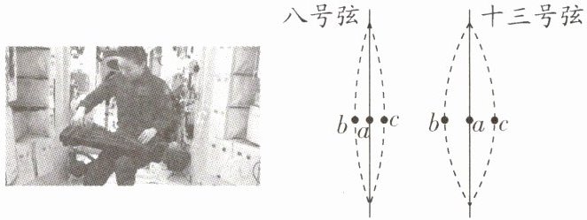 8. 如图所示,王亚平在“天宫”弹奏古筝,分别拨动古筝的八、十三号弦,用同一设置的相机拍摄到两弦最左摆到b处,最右摆到c处,静止时在a处.测出每振动880次,八号弦用时2 s,十三号弦用时4 s,则八号弦( )