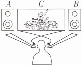 10. 人可以依靠两只耳朵来判断发声物体的方位,从而对声音世界有立体的感觉.如图,舞台上利用左右两只扬声器(喇叭)A、B来形成立体声效果,如果从扬声器所发出的声音是A强B弱,人会感觉到这个声源在A、C之间某位置,这里人作出判断主要利用声音的( )