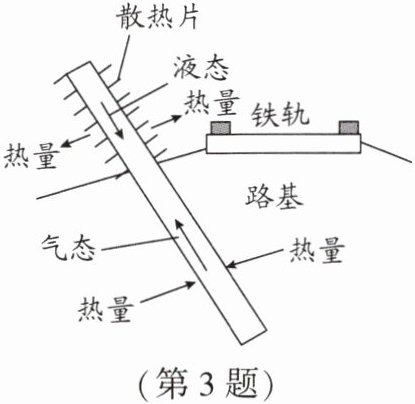 3. 如图是铺在青藏铁路冻土区路基两侧的“热棒”示意图。为了保持路基冻土不熔化,使用它能对路基进行主动____(填“升温”或“降温”)。热棒的工作原理是:当路基温度上升时,液氨____(填“吸收”或“放出”)热量变成气态氨上升到热棒的上端;通过散热片散热,气态氨发生____(填物态变化名称)又沉入了棒底。