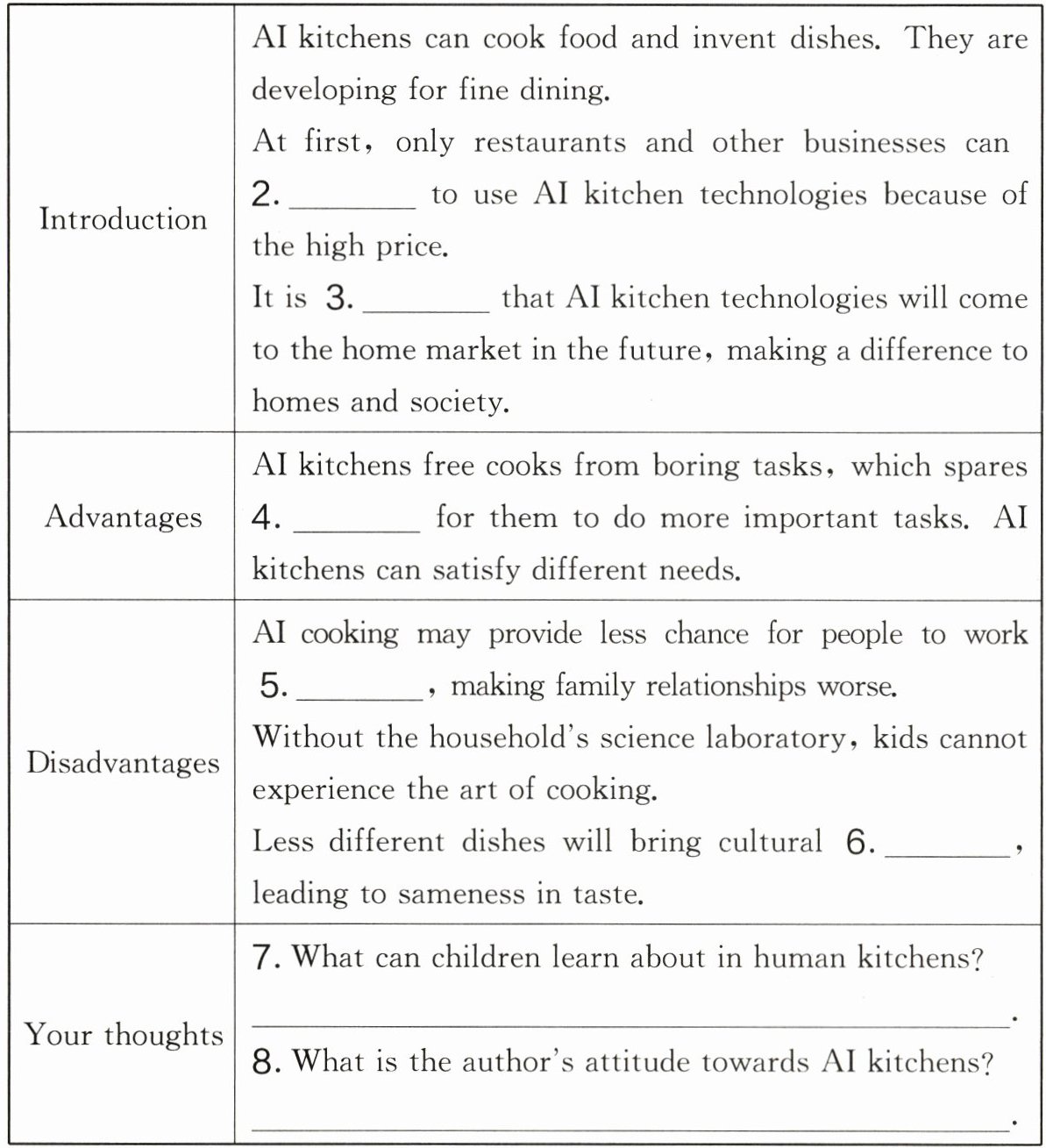 6. risks [解析]根据“Cultural risks must also be considered... This may result in AI and robot cooks producing less different dishes.”可知,AI厨房会导致文化风险。故填risks。