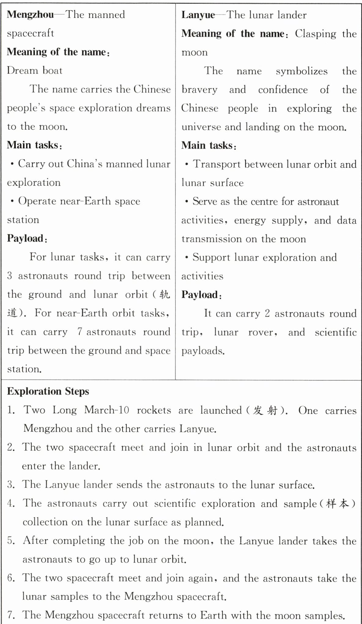 六、【文章大意】本文主要介绍了即将将宇航员送上月球的载人飞船“梦舟”和着陆器“揽月”的一些信息。