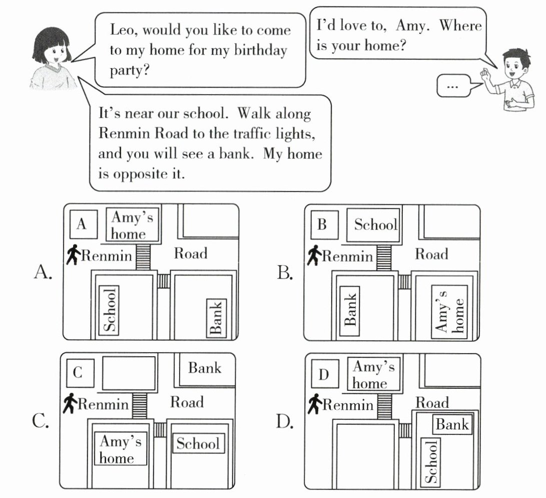 18.B [解析]考查常识和图片理解。句意:根据以下对话,哪张地图是正确的?根据“It’s near our school. Walk along Renmin Road to the traffic lights,and you will see a bank. My home is opposite it.”可知,她家在学校附近,沿着人民路走到交通灯处,会看到一家银行,她家就在银行对面,结合选项可知,选项B符合。故选B。
