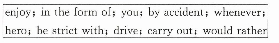 1.yourself/yourselves 2.be strict with 3.enjoying 4.was driving 5.would rather 6.heroes 7.Whenever 8.in the form of 9.carries out 10.by accident