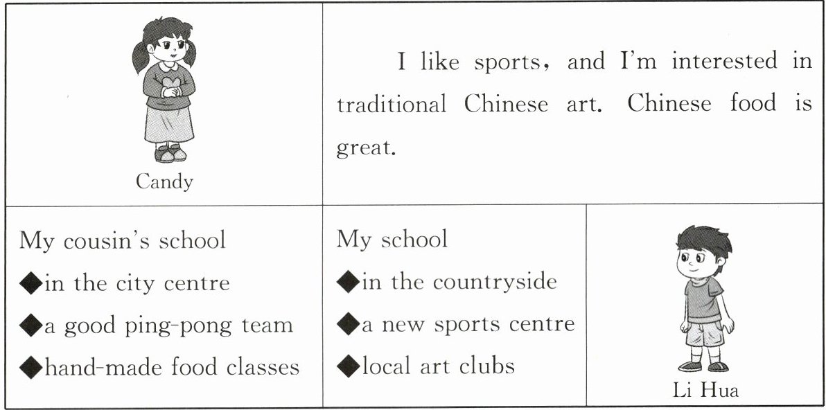 I know you love traditional Chinese art and food. I think my school is perfect for you. It is in the beautiful countryside. The local food here is really fresh and delicious. I believe you’ll enjoy it. Last year, we built a new sports centre, so we can play basketball together there! Also, our school has traditional art classes, and you can learn paper cutting, Chinese painting and so on. I’m sure you’ll love my school. Looking forward to your coming.