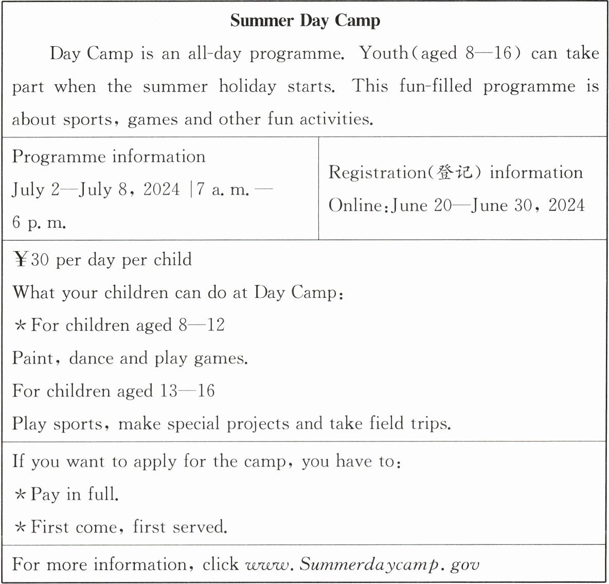 3.A [解析]细节理解题。根据“For more information, click www.Summerdaycamp.gov”可知,通过浏览网址可以得知更多信息。故选A。