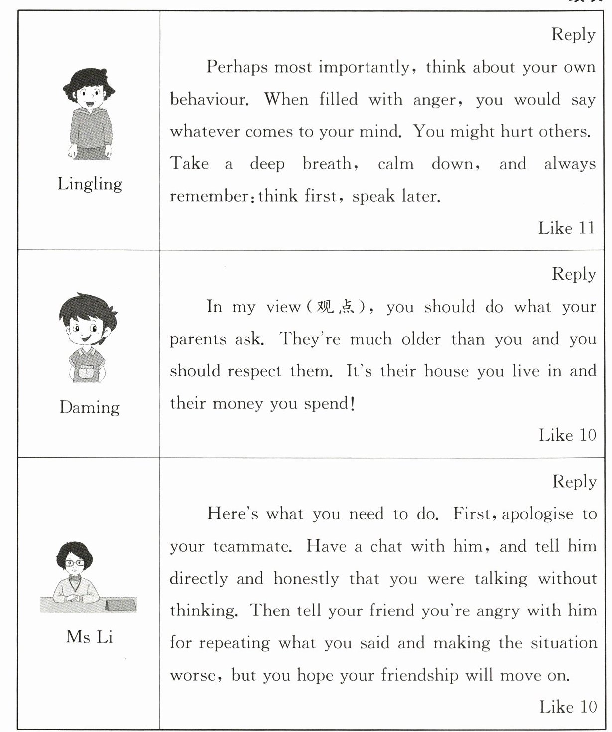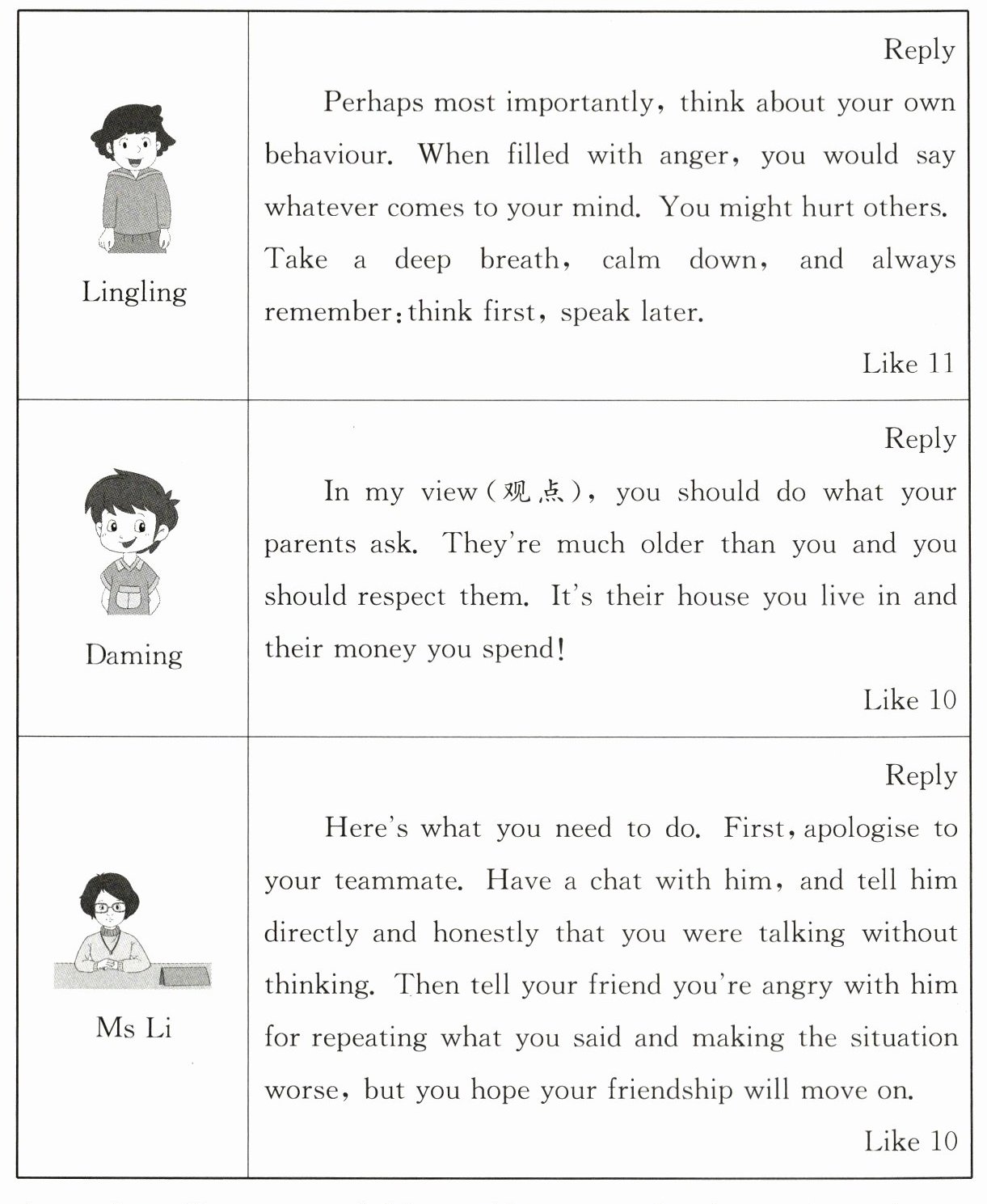 3.D [解析]细节理解题。根据“In my view(观点), you should do what your parents ask. They’re much older than you and you should respect them. It’s their house you live in and their money you spend!”可知,大明的回复“听父母的话”与托尼的问题,即“如何处理与朋友和队友之间的矛盾”无关。故选D。