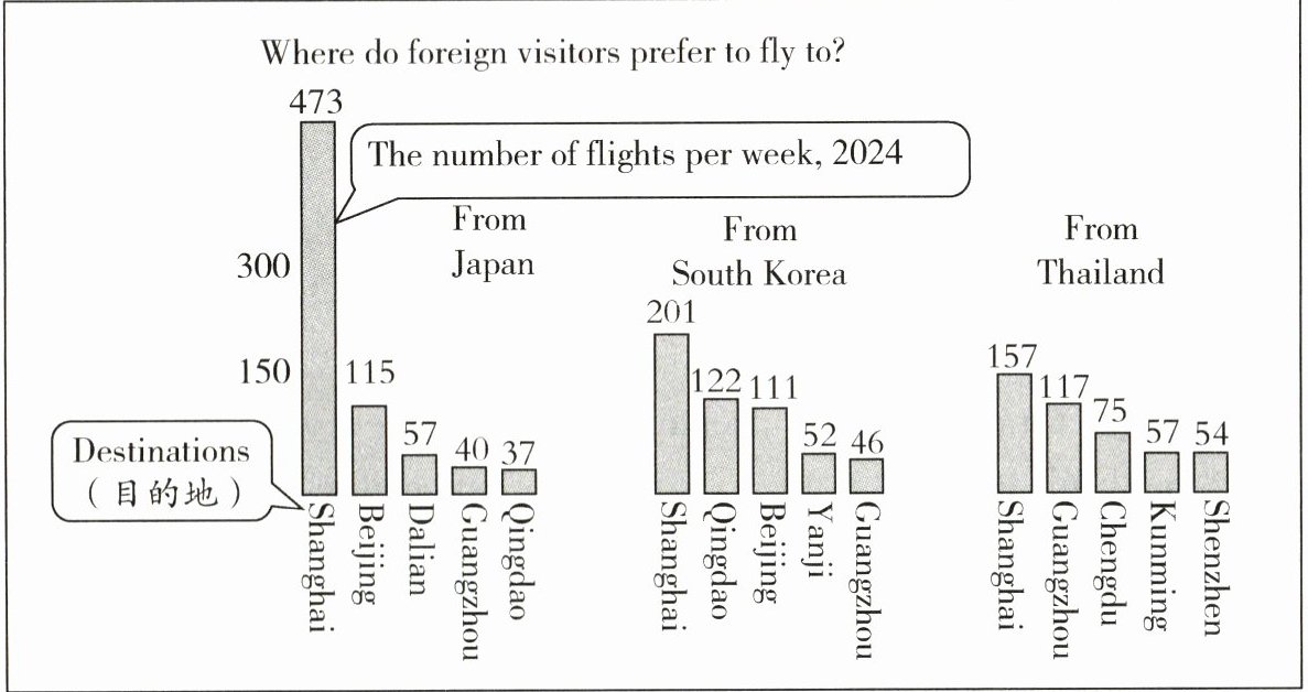 47.C [解析]推理判断题。根据图示可知,在来自日本、韩国、泰国等地的游客中,将上海当作旅游目的地的人数占比最多;由此可推知,上海是最受外国游客欢迎的城市。故选C。