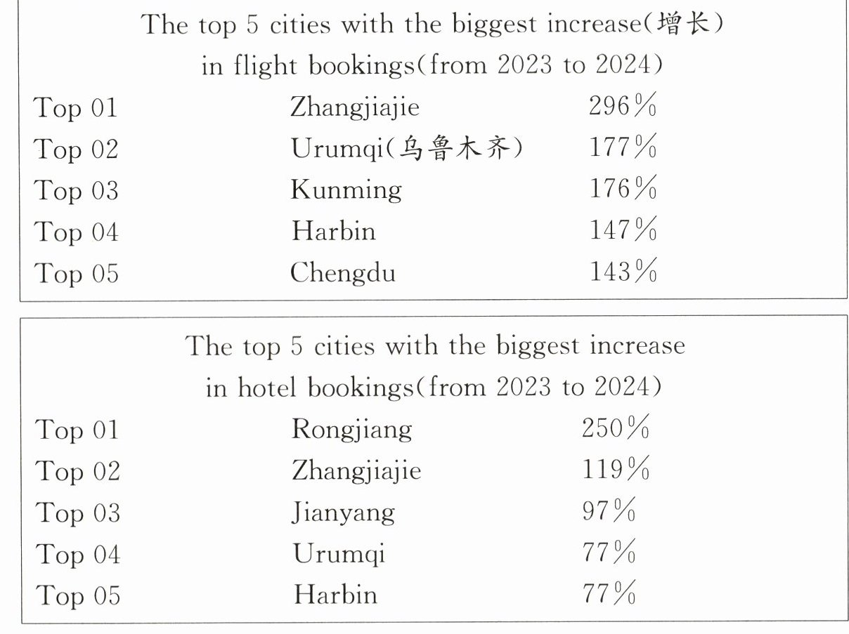 46.A [解析]细节理解题。根据“The top 5 cities with the biggest increase(增长) in flight bookings(from 2023 to 2024)|Top 01 Zhangjiajie 296%”和“The top 5 cities with the biggest increase in hotel bookings(from 2023 to 2024)|Top 02 Zhangjiajie 119%”可知,张家界航班预订增长296%;酒店预订增长119%。张家界这两项增长总数最多。故选A。