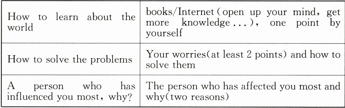 I learned about the world in different ways. I like reading books, which can help me open up my mind, get a lot of knowledge and learn more about people and things. And I also learned a lot from my parents. They taught me how to be a kind person. On the way I had many problems. For example, I could not achieve a balance between my schoolwork and my hobbies. Then my head teacher told me to make a study plan tell sb to do sth告诉某人做某事 and work out the time I could spend on my hobbies. Besides, I was not good at English, and my deskmate helped me with be good at sth擅长某事 my English. She told me many learning methods to improve my English. The person who influenced me most was my teacher. She encouraged me and gave me advice.
