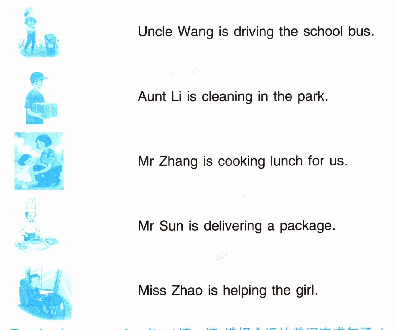 3. Mr Zhang (图:cooking lunch) — 连 “Mr Zhang is cooking lunch for us.”