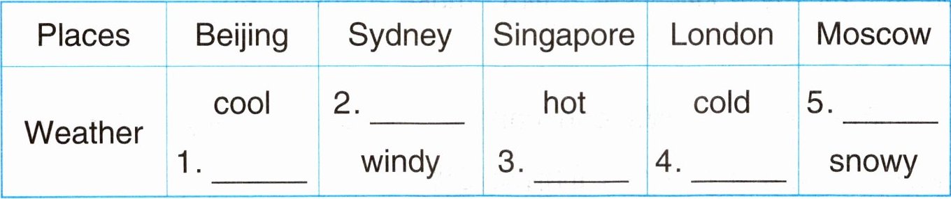 This is the global weather forecast. It's cool and sunny in Beijing today. It's warm and windy in Sydney. It's hot and cloudy in Singapore. It's cold and rainy in London. It's cold and snowy in Moscow.