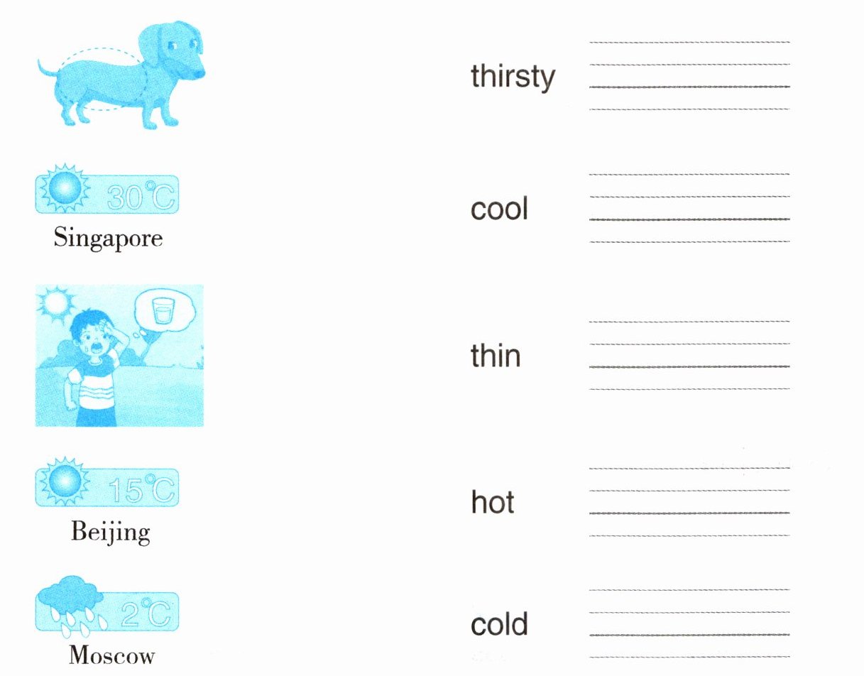 thirsty - 第三幅图; cool - 北京15℃图; thin - 第一幅小狗图; hot - 新加坡30℃图; cold - 莫斯科2℃图