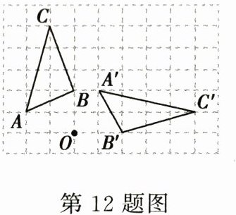 12. 在如图的方格纸(1格长为1个单位长度)中,$\triangle ABC$的顶点都在格点上,将$\triangle ABC绕点O按顺时针方向旋转得到\triangle A'B'C'$,使各顶点仍在格点上,则其旋转角的度数是______.