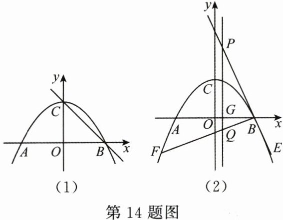 14. (10 分)(2025·武汉期中)如图(1), 抛物线 $ y = -\dfrac{1}{4}x^2 + 4 $ 交 $ x $ 轴于 $ A $, $ B $ 两点, 交 $ y $ 轴于点 $ C $.