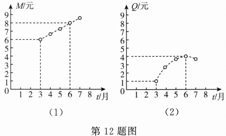 12. (15分)(2025·金华期中)某商业公司为指导某种应季商品的生产和销售,对3月至7月该商品的售价和生产进行了调研,结果如下:一件商品的售价$M$(元)与时间$t$(月)的关系可用一条线段上的点来表示,如图(1),一件商品的成本$Q$(元)与时间$t$(月)的关系可用一条抛物线上的点来表示,其中6月成本最高,如图(2).