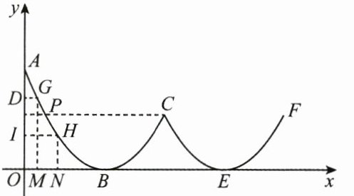 (2)在轨道上有两个位置点 $ P $ 和点 $ C $ 到地面的距离均为 $ n $ m,当过山车运动到点 $ C $ 处时,又进入下坡段 $ C \to E $ (接口处轨道忽略不计, $ E $ 为轨道最低点),已知轨道抛物线 $ C \to E \to F $ 的形状与抛物线 $ A \to B \to C $ 完全相同,点 $ E $ 的坐标为 $ (33,0) $,求 $ n $ 的值;