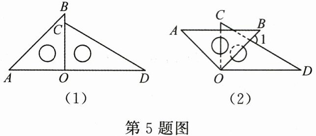 5. (3分)(2024·滨州中考)一副三角尺如图(1)摆放,把三角尺 $ AOB $绕公共顶点 $ O $顺时针旋转至图 (2),即 $ AB // OD $时,$ \angle 1 $的度数为 ______ 。