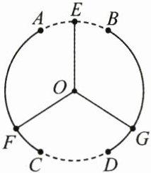 9. (3 分)(2025·台州仙居县期末)某酒店的圆形旋转门可看成由外围的$\odot O$和三翼隔风玻璃组成(示意图如图所示),外围圆有通道弧$AB和弧CD$,且它们关于圆心$O$中心对称,圆内的三翼隔风玻璃可绕圆心$O$转动,且所成的夹角$∠EOF = ∠FOG = ∠GOE = 120^{\circ}$,三翼隔风玻璃在转动过程中,始终使大厅内外空气隔离,起到对大厅内的保温作用.例如,当隔风玻璃转到如图所示位置时,大厅内外空气被隔风玻璃$OF$,$OG$隔离.通道弧$AB$所对圆心角的度数的最大值为 (
