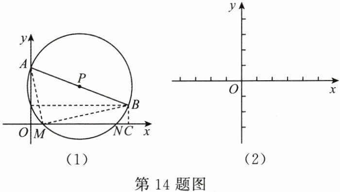14. (10 分)某数学家给出了一元二次方程$x^{2}+bx + c = 0$的几何解法:如图(1),在平面直角坐标系中,已知点$A(0,1)$,$B(-b,c)$,以$AB为直径作\odot P$.若$\odot P交x轴于点M(m,0)$,$N(n,0)$,则$m$,$n为方程x^{2}+bx + c = 0$的两个实数根.
