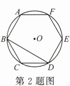 2. (3 分)如图, 正六边形 $ ABCDEF $ 内接于 $ \odot O $, 连接 $ BD $, 则 $ \angle CBD $ 的度数是 (