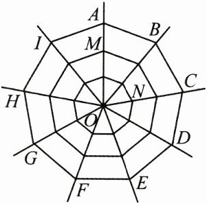 9. (3 分)一个蜘蛛网如图所示, 若多边形 $ ABCDEFGHI $ 为正九边形, 其中心点为点 $ O $, 点 $ M $, $ N $ 分别在射线 $ OA $, $ OC $ 上, 则 $ \angle MON = $