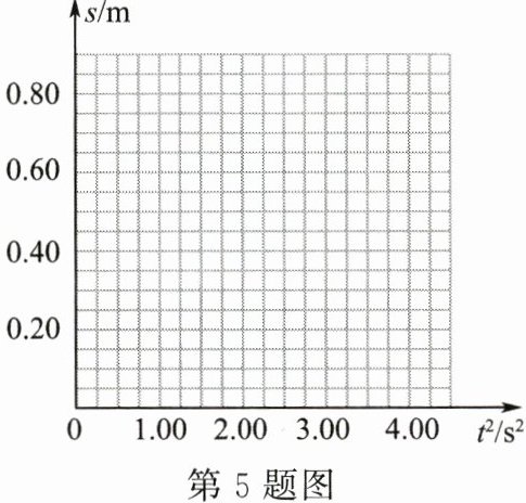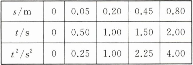 (2)通过视频查找出小车5次的位置,小车从开始运动到各个位置的路程s和对应时间t见表所示,表中第三行数据为对应时间的平方。根据表中数据,在坐标纸上作出小车运动的$ s-t^{2}$图像。