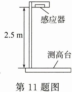 11. (3 分)(2023·安徽中考)如图所示为一种身高测量仪,其顶部的感应器竖直向下发射超声波信号,经下方物体反射后返回,被感应器接收。某同学站上测高台,感应器记录信号从发射到接收所经历的时间为$ 5×10⁻^3 s。$已知感应器距测高台的高度为 2.5 m,空气中的声速取 340 m/s,则该同学的身高为 (