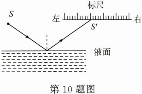 ;光经液面反射后射到液面上方水平标尺上的$S'$点,当液面下降时,点$S'$将向右