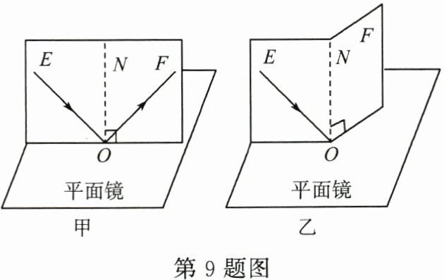 (选填“贴着”或“垂直”)纸板射到平面镜上,在纸板上会看到反射光线$OF$,如图甲所示。然后将纸板绕$ON$向后折,如图乙所示,此时在$NOF$面上看不到反射光线,此时有