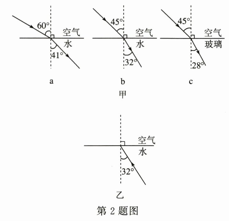 (3)根据图甲给出的信息, 在图乙中画出光以 $ 32^{\circ} $ 的入射角从水斜射入空气中时, 在空气中的传播路径。(要求在图上标出折射角及其度数)