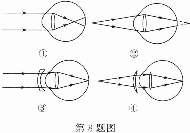 8. (4分)(2024·青岛检测)如图所示四幅图,能正确表示近视眼的成因和矫正的示意图是(