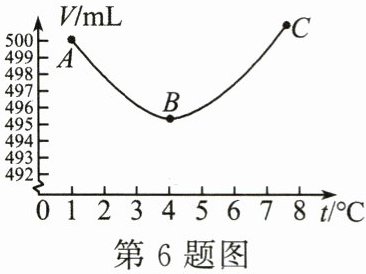 6. (3 分)某同学利用一定量的水,研究水的体积随温度变化的关系,并根据实验数据作出 $ V - t $ 图像,如图所示。请根据此图像判断,下列说法正确的是(