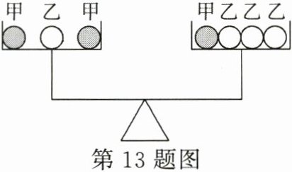 13. (3 分)(2024·怀化期末)如图所示,由不同物质制成的甲、乙两种实心球的体积相等,此时天平平衡,则制成甲、乙两种球的物质密度之比为(