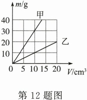 12. (3 分)甲、乙两种物质的质量与体积关系的 $ m - V $ 图像如图所示,甲、乙密度大小关系为(