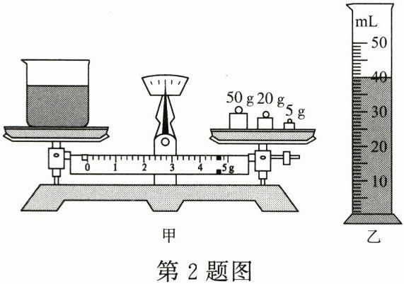 2. (3分)小明在实验室测量饮料的密度。调节好天平后,将装有适量饮料的烧杯放在天平左盘,在右盘中加减砝码并移动游码,天平再次平衡后,所加砝码和游码的位置如图甲所示,则烧杯和饮料的总质量为