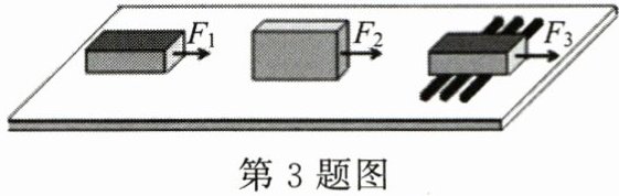 3. (4 分)在研究摩擦力时,小龙同学用一块各侧面光滑程度完全相同的木块,在同一水平桌面上进行了三次实验,如图所示,当用弹簧测力计水平拉木块做匀速直线运动时,弹簧测力计三次示数 $ F_{1} $、$ F_{2} $、$ F_{3} $ 的大小关系为(