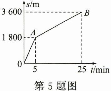 5. (4分)如图是小刚从家中出发到达学校的 $ s - t $ 图像。其中一半路程步行,一半路程骑自行车,则小刚骑车是图中______(选填“$ OA $”或“$ AB $”)段,小刚从家中到学校的平均速度为______ $ m/s $。