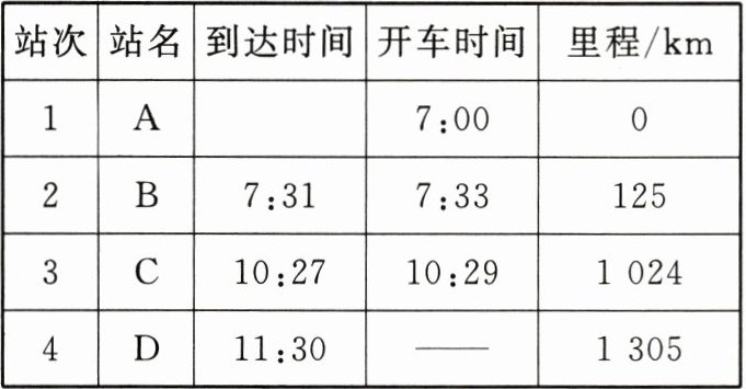 (1)该次列车从A站到达D站运行的时间$t_1=11:30-7:00=4h30min=4.5h$,从A站到达D站运行的平均速度$v_1=\frac{s_1}{t_1}=\frac{1305km}{4.5h}=290km/h$。