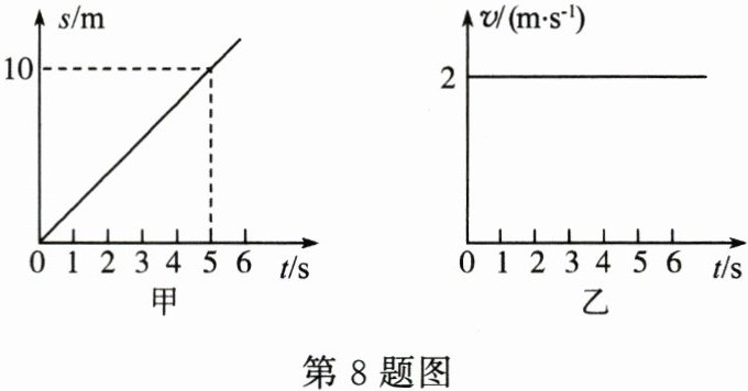 8. (3分)如图甲是小车 $ a $ 运动的 $ s - t $ 图像,如图乙是小车 $ b $ 运动的 $ v - t $ 图像,由图像可知 (
