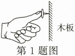 1. (4分)(2025·安阳期末)图钉尖的面积是$5×10^{-8}m^{2}$,图钉帽的面积是$1×10^{-4}m^{2}$。如图所示,将图钉缓慢按进木板中时,手对图钉帽的压力与图钉尖对木板的压力之比为$