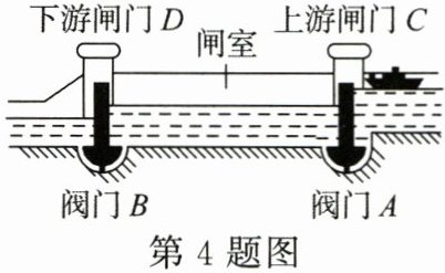 4. (4分)(2025·青岛模拟)船闸是利用连通器的原理进行工作的。如图所示,上游一艘客轮准备通过船闸进入下游。客轮进入闸室前,应(