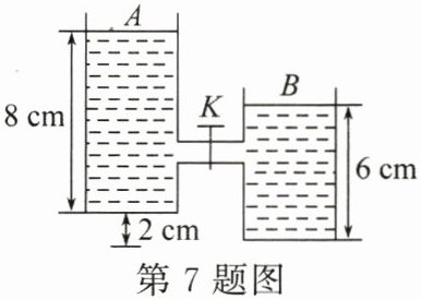 A 解析:若将阀门K打开,容器A、B构成连通器,水从容器A向容器B流动,在水不流动时,两容器中液面高度是相同的;已知A、B为完全相同的两个容器,且原来两水面的高度差Δh=8 cm+2 cm-6 cm=4 cm,打开阀门K后,两容器中的液面相平,A液面下降2 cm,变为h_A=6 cm,B液面上升2 cm,变为h_B=8 cm,所以A、B两容器底部受到水的压强之比为$\frac{p_A}{p_B}=\frac{\rho_水gh_A}{\rho_水gh_B}=\frac{h_A}{h_B}=\frac{6\ cm}{8\ cm}=\frac{3}{4},$故选A。