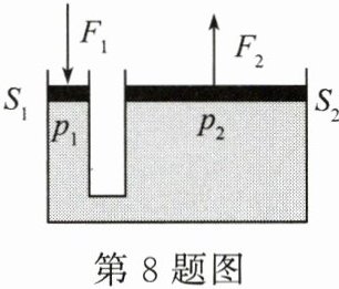 8. (4分)如图所示,两活塞面积之比$S_1:S_2= 1:5,$两活塞受到的压力分别为$F_1、$$F_2,$受到的液体的压强分别为$p_1、$$p_2,$下列关系式正确的是(