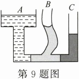 9. (12分)如图是由三个容器组成的连通器。待三种不相溶液体不流动时,液面高度有所不同,则三个容器中液体对管底的压强p_A