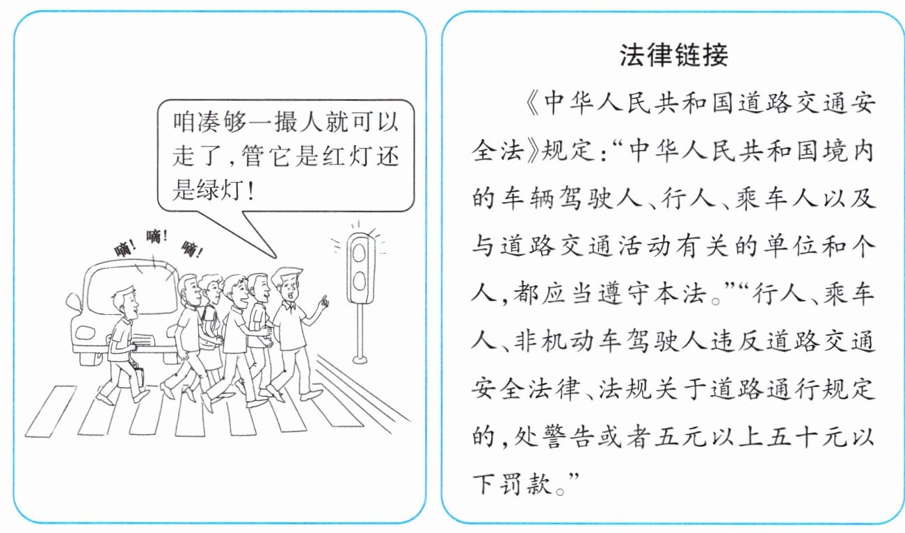 (2)【示例】积极主动地学习交通法规条文,掌握必备的交通常识;自觉遵守交通法规,严守信号灯指示,绿灯时快速通过斑马线;过马路前观察车辆,确保安全后直行通过。