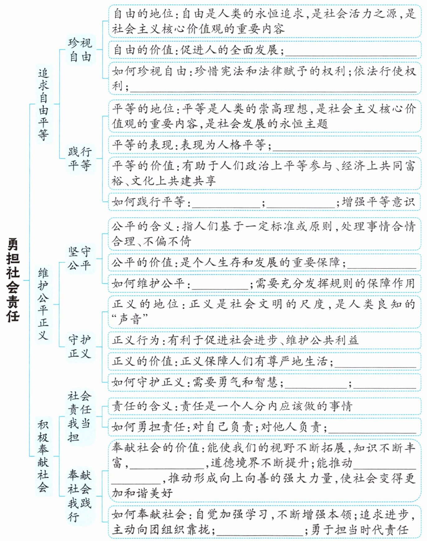 推动社会的繁荣进步 尊重他人的权利 意味着权利义务平等 平等对待他人 敢于抵制不平等行为 是社会稳定和进步的重要基础 需要每个人努力追求公平、捍卫公平正义营造风清气正的社会风尚 需要维护司法公正 需要维护国际正义 对国家和社会负责 能力不断提高 国家发展、社会进步 积极参与志愿服务活动